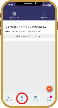 連携完了後、アプリ内の大会ページに「くすのきカントリーマラソン ONLINE 2021」が表示されていれば、準備完了です。